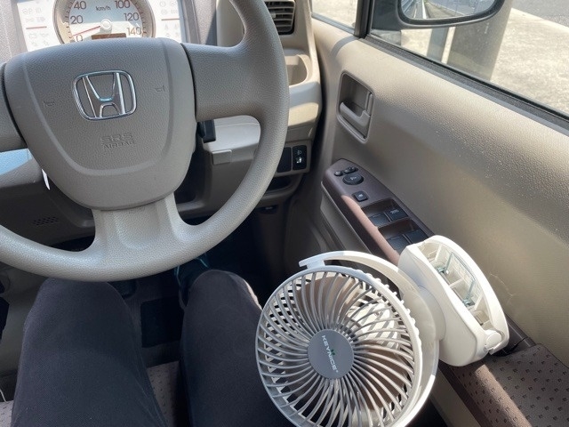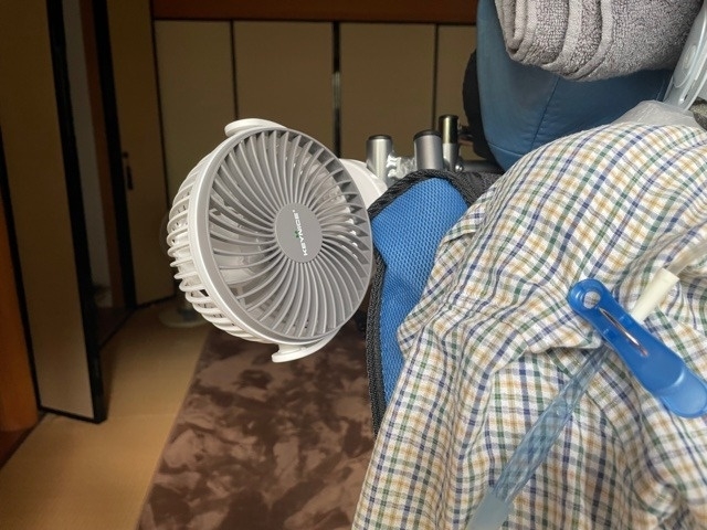 真夏日が続いています。ほんとに暑い。やっぱり移動の車内が一番つらいです。クーラー全然涼しくない。なので、ポータブルの扇風機を持ち込んでみました(写真)。いつもキャンプで使うもので、普段は長男がベッドに取り付けて使っています。灼熱の車に乗ってスイッチONすると、熱風がきます。熱風でも風がないよりマシです。そして、利用者さんの散歩の時にも使えるんです。写真のように取り付けてみました。背中が蒸れるので首から背中に当たるように。グリップタイプでどこにでもつけられるし、角度も自由自在です。充電式で連続6時間OK。暑い中でも体調を崩さずお散歩を楽しんで欲しいと思います。